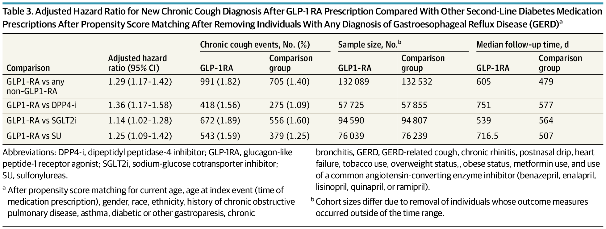 Question Is the use of glucagon-like peptide-1 receptor agonists (GLP-1RAs) associated with increased risk of chronic cough?