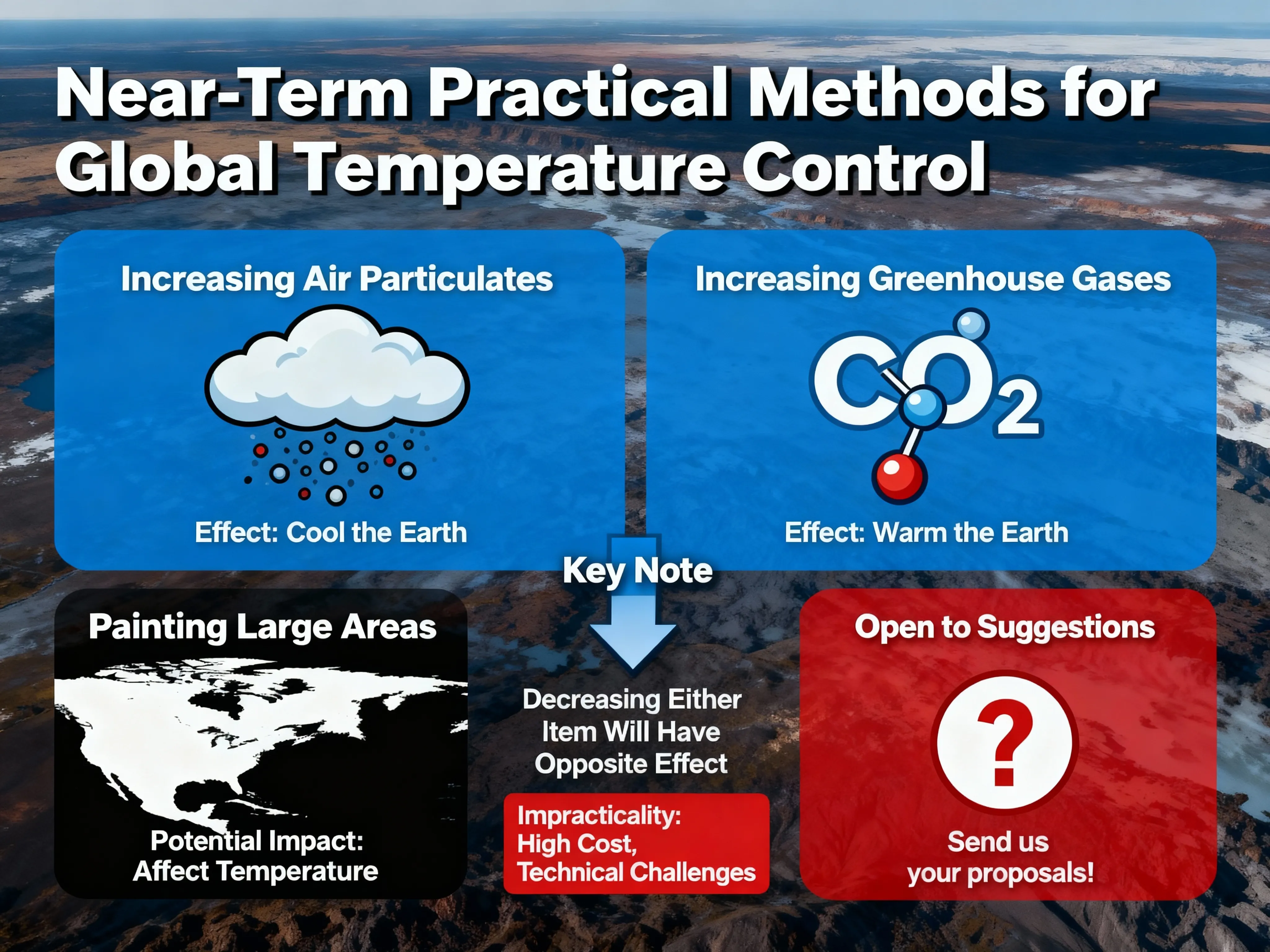 Known practical methods for controlling the world’s temperature are increasing amount of particulants in the air (to cool the earth) and increasing the amount of greenhouse gases (to warm the earth). Decreasing either item would have the opposite effect. Painting a large area white or black could effect the temperature, but this doesn’t seem practical. We are open to other suggestions.